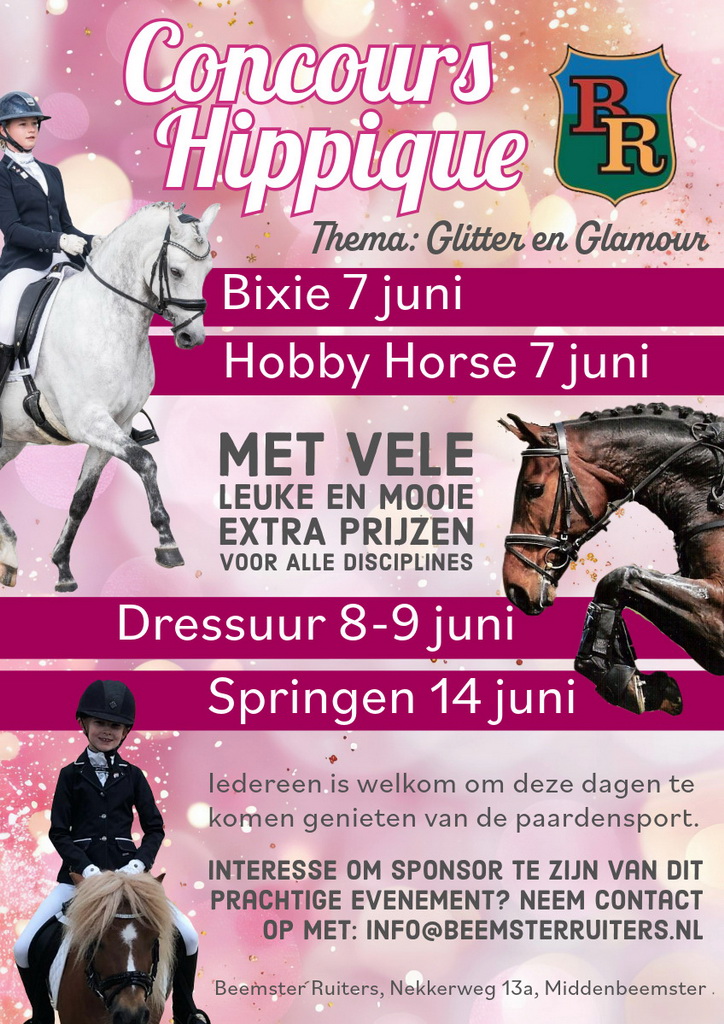 Groot feest bij de Beemster Ruiters Nieuws by sjaakmartens - 31 mei 202529 mei 2025 Komt u allen!! Met of zonder paard!! Binnenkort is het grote concours hippique bij de Beemster Ruiters. Leuk voor ruiters, maar ook fantastisch voor niet-ruiters. Er zijn dressuur- en springwedstrijden en voor de allerkleinsten: bixie wedstrijden. Voor niet-ruiters zijn er hobby-horse wedstrijden. Dat is strijden om prijzen met een stokpaard in een mooi opgezet parcours. Er wordt zowel een dressuur- als een springparcours uitgezet. Iedereen kan er dus aan meedoen. Het thema is: glitter en glamour. Dus leef je uit om er mooi versierd uit te zien. Loop als een echte ster over de rode loper. Het programma is als volgt: Zaterdag 7 juni:‘s morgens: Bixie (kleine pony’s en jonge kinderen);12.30 hobbyhorse dressuur jeugd;15.00: hobbyhorse springen jeugd; 17.00: hobbyhorse volwassenen =VOL, kijken kan nog wel! Zondag 8 en maandag 9 juni: dressuur paarden en pony’s. Zaterdag 14 juni: springen paarden en pony’s. Voor deelname aan de hobbyhorse-wedstrijden kun je je opgeven via info@lolmetjehobbyhorseknol.nl . Deelname kost voor de jeugd € 14,- voor alle onderdelen. Voor volwassenen zijn deelnamekosten €27,-. Voor meer informatie kunt u naar www.lolmetjehobbyhorseknol.nl. Voor wie echt aan de bak gaat met zijn/haar hobbyhorse zijn er prachtige prijzen te winnen. Daarnaast is er voor de kinderen nog een leuke kleurwedstrijd. Inleveren kan op 7 juni tijdens de bixie wedstrijd in de kantine bij het secretariaat. Wil je hem al eerder inleveren dan kan je hem in de brievenbus doen welke is bevestigd aan de toegangspoort. Zorg dat je gegevens duidelijk op de kleurplaat staan! Inleveren kan tot uiterlijk 7 juni om 14 uur. Er zijn prijzen te verdienen voor 3 categorieën: t/m 5 jaar, 6 t/m 9 en 10 t/m 12. De prijsuitreiking zal zaterdag 7 juni rond 15 uur plaatsvinden in de kantine. Op het terrein van de Beemster Ruiters zijn leuke standjes te vinden. En natuurlijk wordt de inwendige mens ook niet vergeten. Bij mooi weer is het heerlijk toeven op het gezellige terras van de Beemster Ruiters. Het gaan gezellige dagen worden. Dat wilt u niet missen. Dus komt allen naar de Beemster Ruiters op Nekkerweg 13A in de Beemster. Kleurplaat wedstrijdDownloaden Dit delen: Klik om te delen op X (Wordt in een nieuw venster geopend) X Klik om te delen op Facebook (Wordt in een nieuw venster geopend) Facebook Gerelateerd