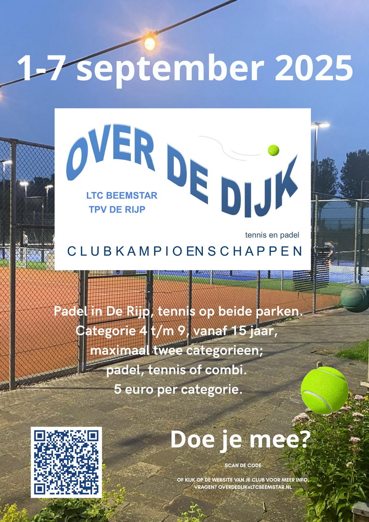 LTC Beemstar en TPV De Rijp slaan opnieuw de handen ineen met ‘Over de Dijk’ toernooi Nieuws by sjaakmartens - 15 juli 202515 juli 2025 Na een succesvolle eerste editie bundelen tennisverenigingen LTC Beemstar en TPV De Rijp dit jaar opnieuw hun krachten voor de gezamenlijke clubkampioenschappen: het ‘Over de Dijk’ tennis- en padeltoernooi. Sinds de aanleg van de padelbanen in De Rijp is de uitwisseling tussen beide clubs alleen maar toegenomen. Steeds meer senioren zijn op beide parken actief, en ook jeugdleden spelen samen competitie. Het idee om samen een clubkampioenschap te organiseren lag dus voor de hand. Een wedstrijdcommissie, met leden uit beide verenigingen, verzorgt de organisatie. Het toernooi vindt plaats in de eerste week van september (1 t/m 7 september) en wordt gespeeld op beide parken. Deelnemers kunnen rekenen op veel wedstrijden, vertrouwde én nieuwe tegenstanders, en natuurlijk de bekende sportieve sfeer — met als extraatje een afsluitende barbecue voor alle deelnemers. Praktische info: Datum: 1 t/m 7 september Voor wie: Leden vanaf 15 jaar Disciplines: Tennis én padel, Categorieën 4 tm 9 Inschrijven: Via Toernooi.nl — zoek op Over de Dijk Vragen? Mail naar overdedijk@ltcbeemstar.nl Met vriendelijke groet, Liesbeth Klinkhamer Albertsma tel 06 13563127 Dit delen: Klik om te delen op X (Wordt in een nieuw venster geopend) X Klik om te delen op Facebook (Wordt in een nieuw venster geopend) Facebook Gerelateerd